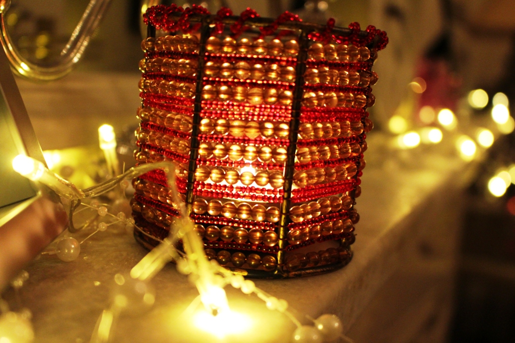 With a bit of imagination as quite honestly we are surrounded by a myriad of things that can be used for home decors and inject originality. One thing I really like is my fairy lights, but I like dainty little fairly lights. I love my candles whether it being block candles, tapered stick or tea lights – I like them scattered around all the rooms in the house. Grouping of candles, soft lighting and sparkling accessories offer just the perfect feel for the festive season. I love ethnic colours, and I get attracted to anything with burgundy red and gold – so here we are a simple storage box I will be using to hide serve some of my mithais when friends visit this weekend.