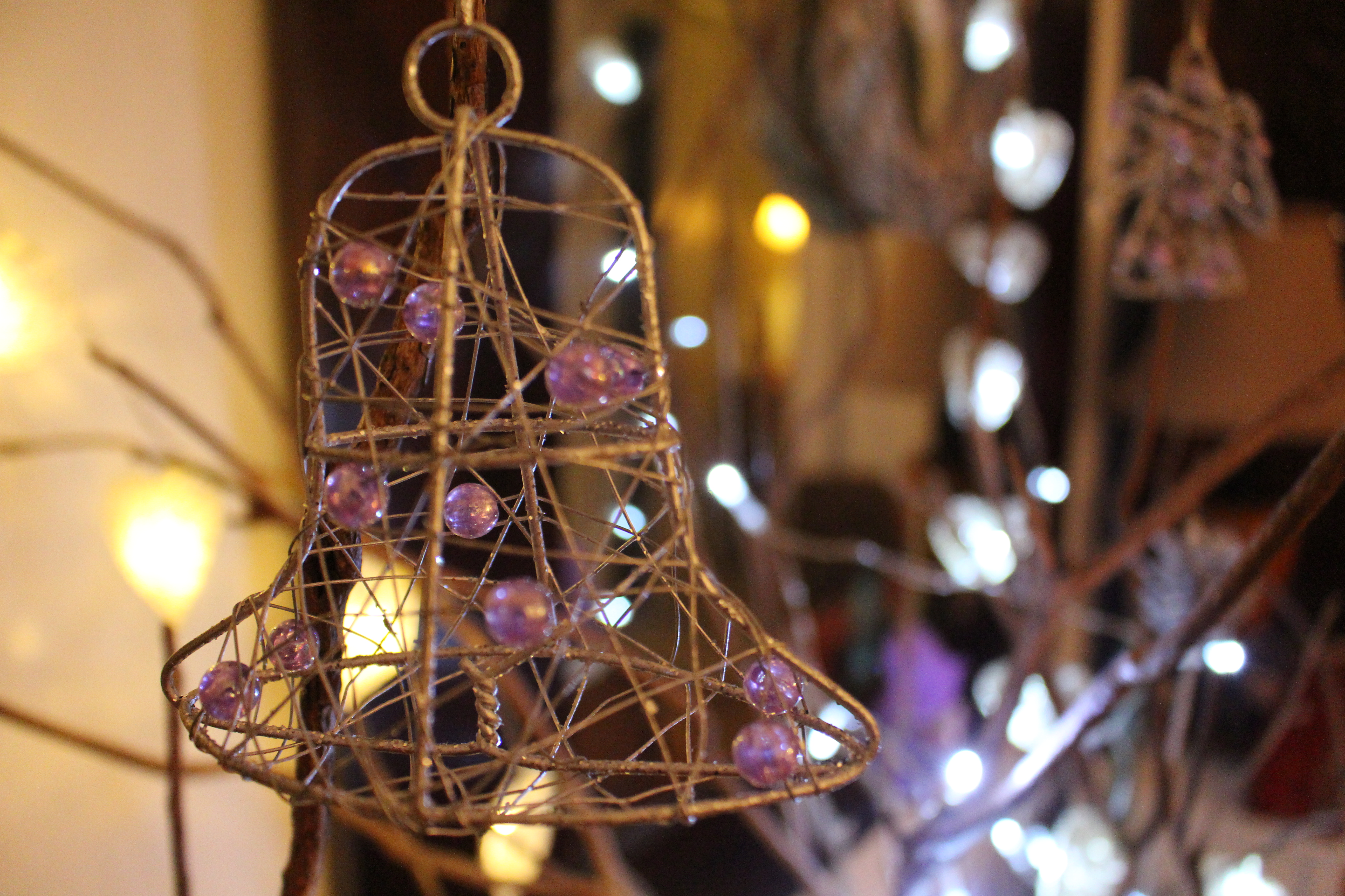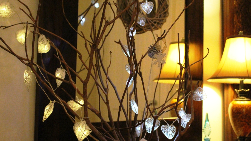 Here I have this dried twig decorated with simple white led lights heart shaped and a few hanging decorations with light lilac pearls. The reflection of the light in the evening is blissful and so serene – This is where I like to sit on my little bench sipping a little sweet after dinner drink.