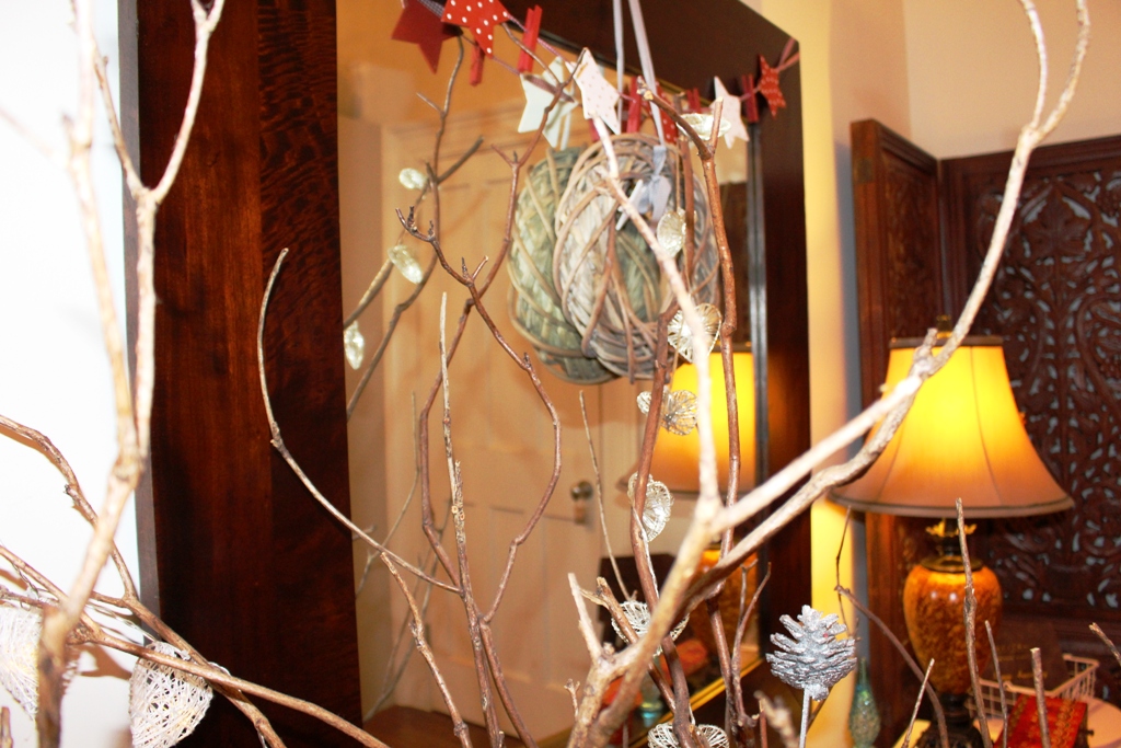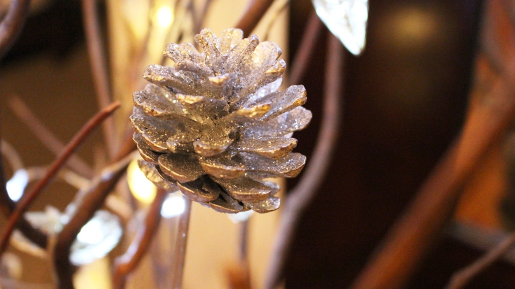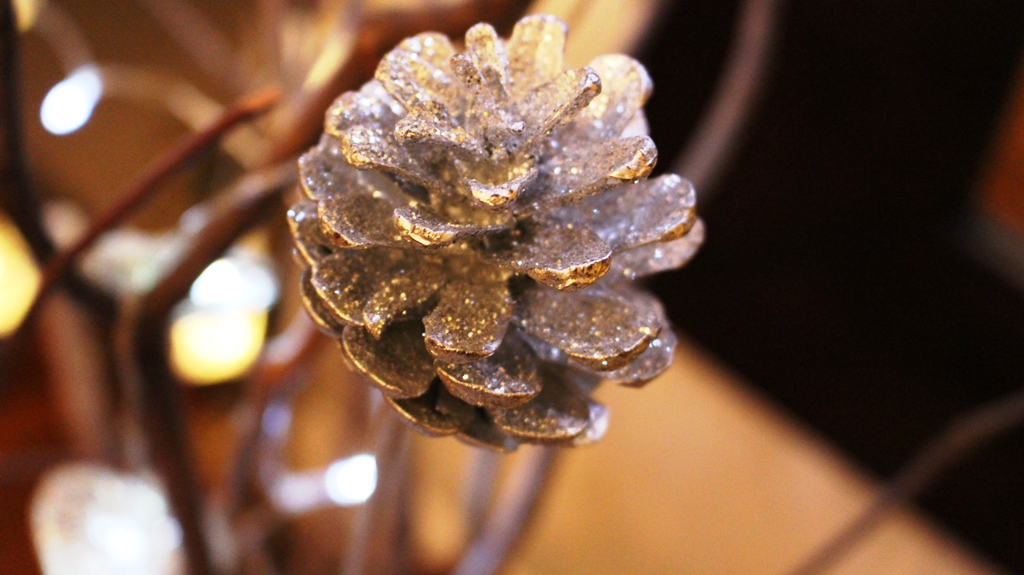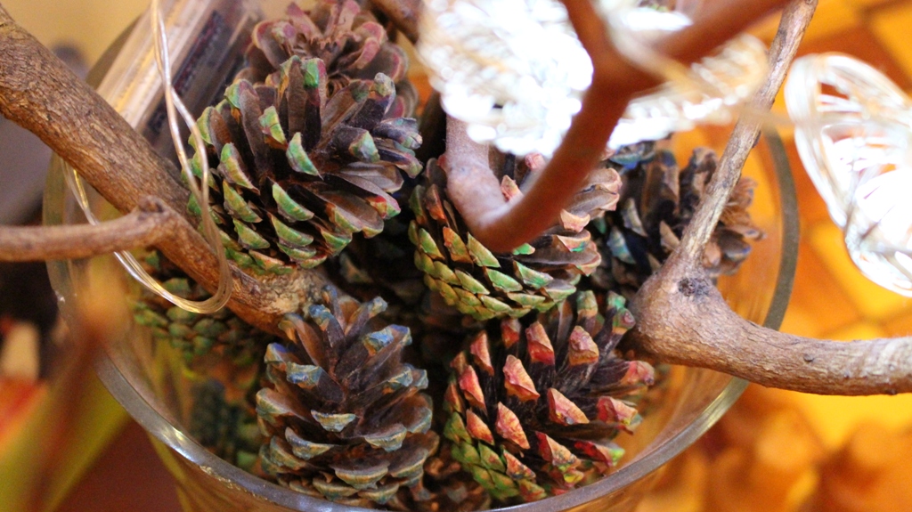 Here are just things I have picked and collected while going for our weekend morning walks in the woods such as dead twigs, pine cones. Brought them home, my husband cleaned them using a dry brush, left them to dry and sprayed them with clear varnish (the varnish helped to reinforce and strengthen the twigs). And here to recreate my indoor festive woods decorated with fairy led lights to recreate a glorious woodland look in my warm cosy room. You can achieve this effortless and simple look too, nothing extravagant it’s just simple nature treasures gathered and brought back to life. The dry twig carefully placed in a deep vase with other natural items – here I have coloured sand, pebbles and pine cones (painted in red, green). I find it creates such a relaxing, cosy mood.