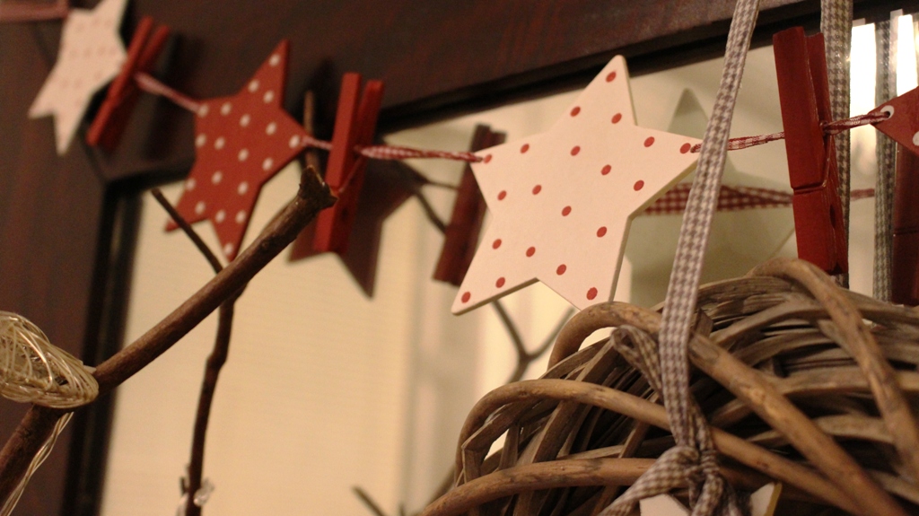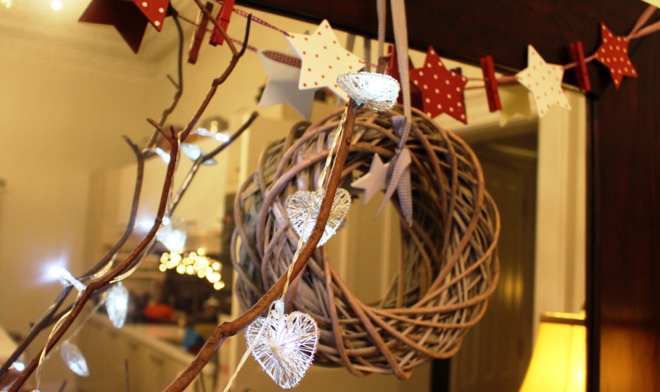 Mirrored reflection takes another dimension in the dining hall with star shaped red and white garland (£1.49 Dunhelm store) paired with a willow wreath hung just above in the middle of the dark wood framed mirror.