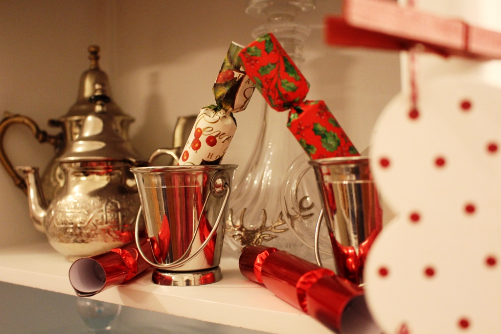 I like to put small Christmas crackers on the shelves – crack them anytime and be merry. These looks so pretty scattered around the house, beautifully vibrant coloured wrapped Xmas crackers.