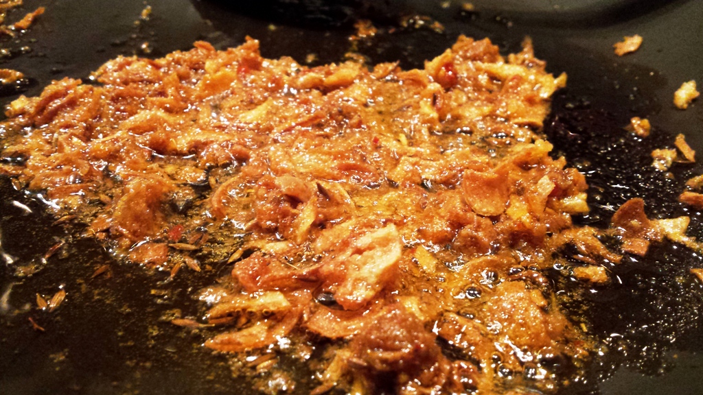 - Place a large skillet or a large non-stick pan over medium high heat. Add the sliced onion fry until slightly brown. Add the Cheeky garlic paste give it a quick stir. Now add the cumin powder and caraway seeds.