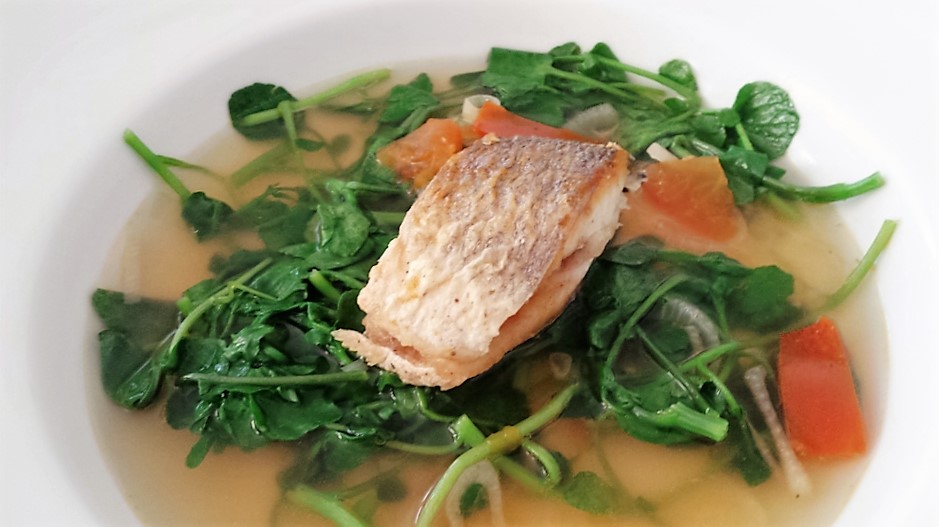 Fish soup is much easier and quicker than it appears. With very few simple ingredients this fish soup is a very healthy option and low in fat and an abundance of fresh taste. The addition of fresh watercress is very much a Mauritian style of making fish soup. Back in Mauritius watercress is usually substituted with Moringa Leaves – “Brede Mouroume” as it is in abundance across the Island and can be found in most people’s home garden.
