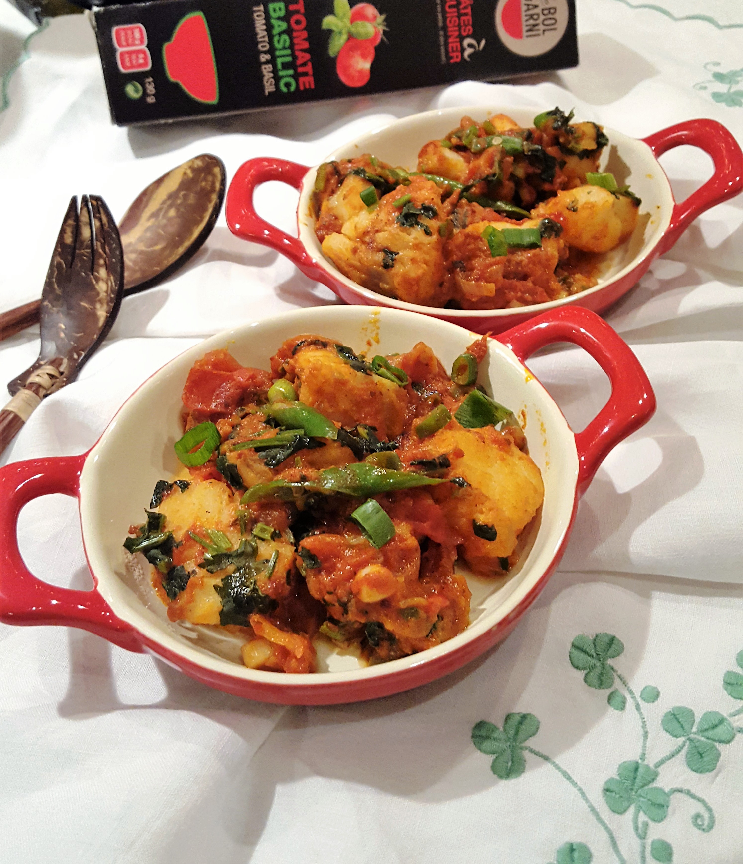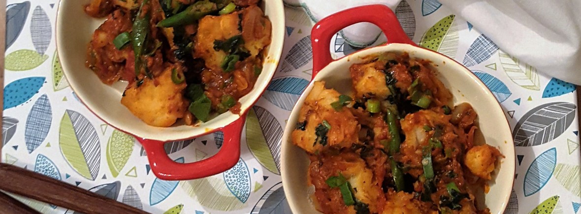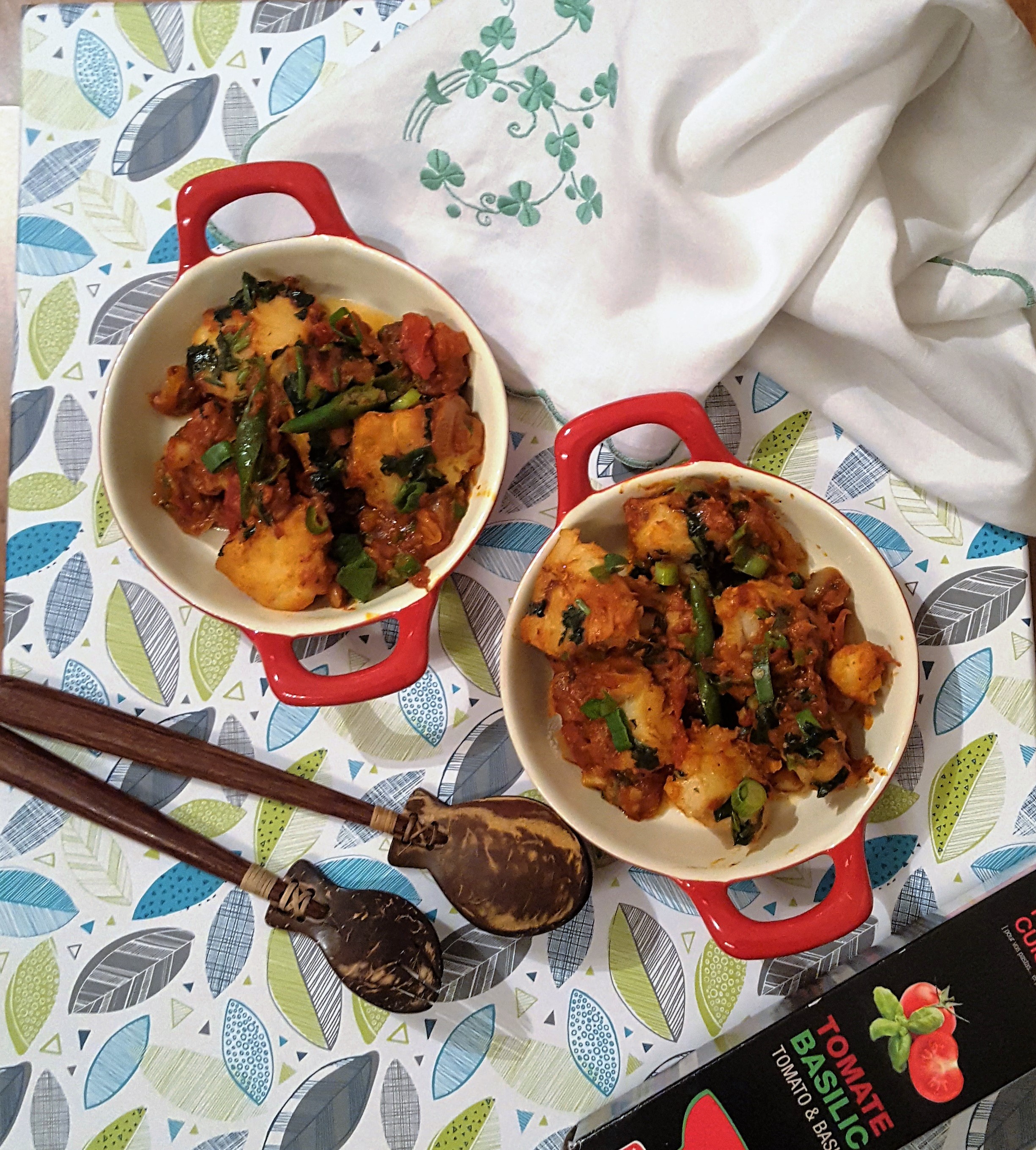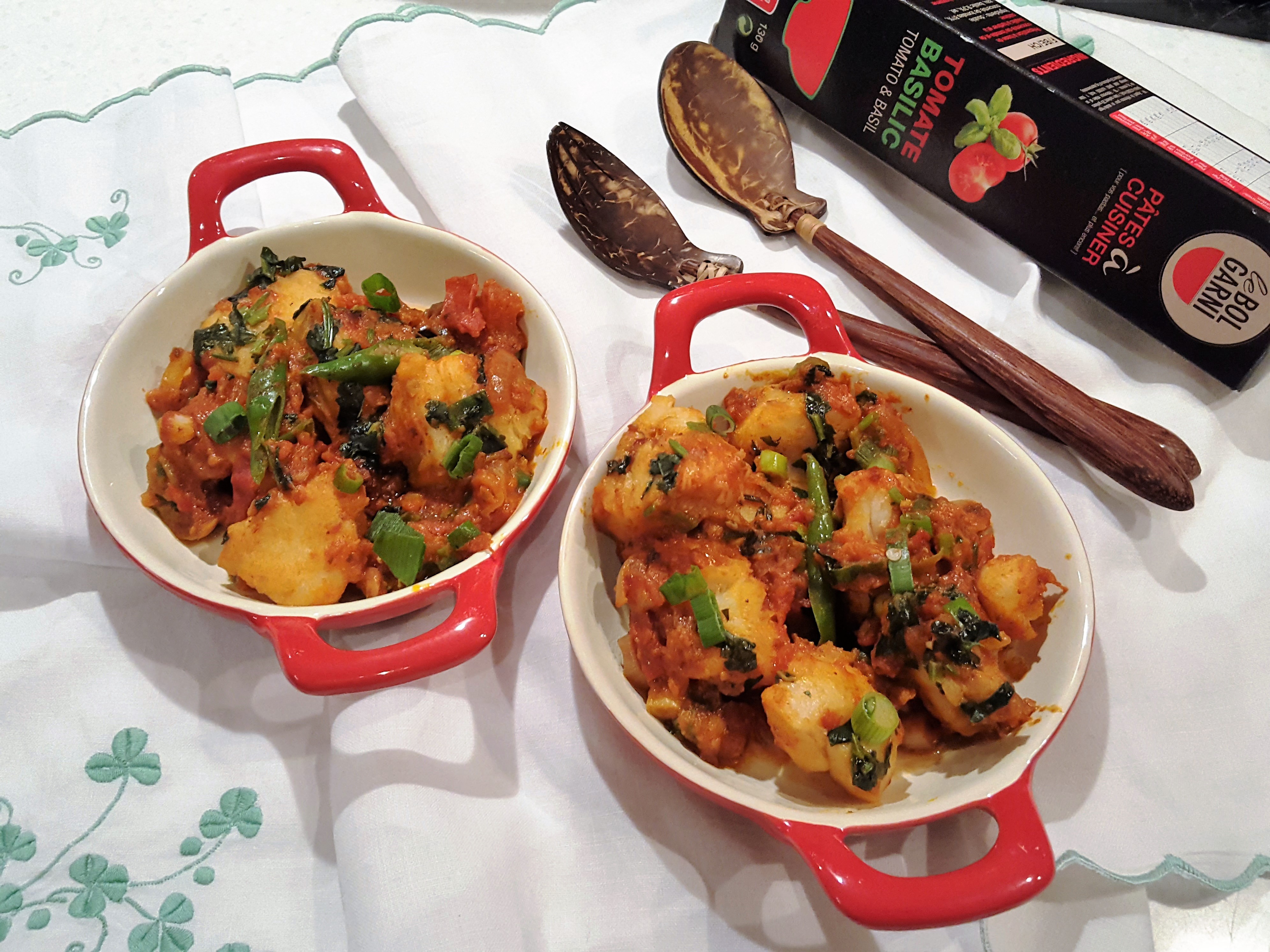 Midweek dinner can be so much fun for me as I get to grab whatever I have in my cupboard & fridge and almost end up with a very easy yet comforting meal. This may sound unreal but believe it’s great to be able to use the most basic and minimal cooking skills that satisfy the taste buds. While ravaging through my freezer after my holidays I decided to make and easy fish “rougaille” – Mauritian style spicy Creole tomato sauce. Using only one tomato and tomato puree, I have this time used a different sauce from “Le Bol Garni” http://lebolgarni.com/ which was gifted to me by my dear friend https://fr-fr.facebook.com/latelierdekristel/ L’Atelier de Kristel. I like to use a little tomato puree in these kind of “Rougaille” as I find it enriches the sauce and give it a darker rich colour. An easy dish to make using minimal ingredients and even easier to eat……