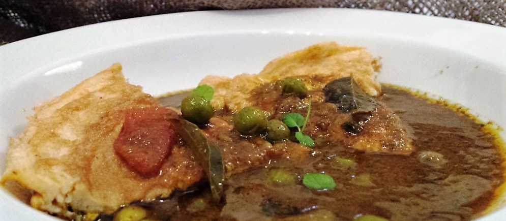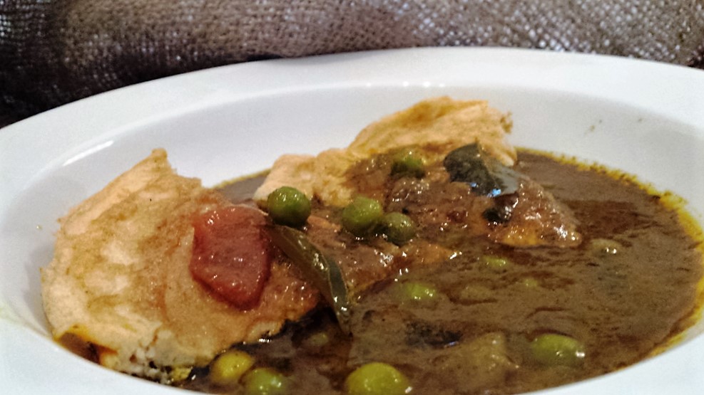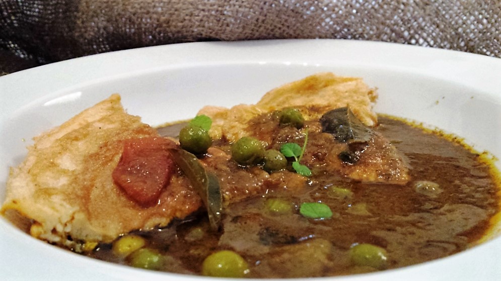 - As the sauce starts to thicken, add a little water to make a thick gravy. Taste for seasoning. Add the peas simmer for another 2-3 minutes. Turn heat off, cut the cooled omelette into slices, add to the curry sauce. Using a ladle spoon the curry gravy on the omelette, cover and leave for few minutes.