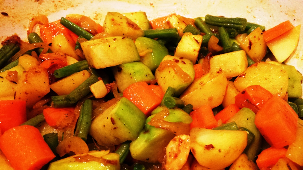 - Chayote releases water on cooking and this helps to tenderize the potatoes and carrots.