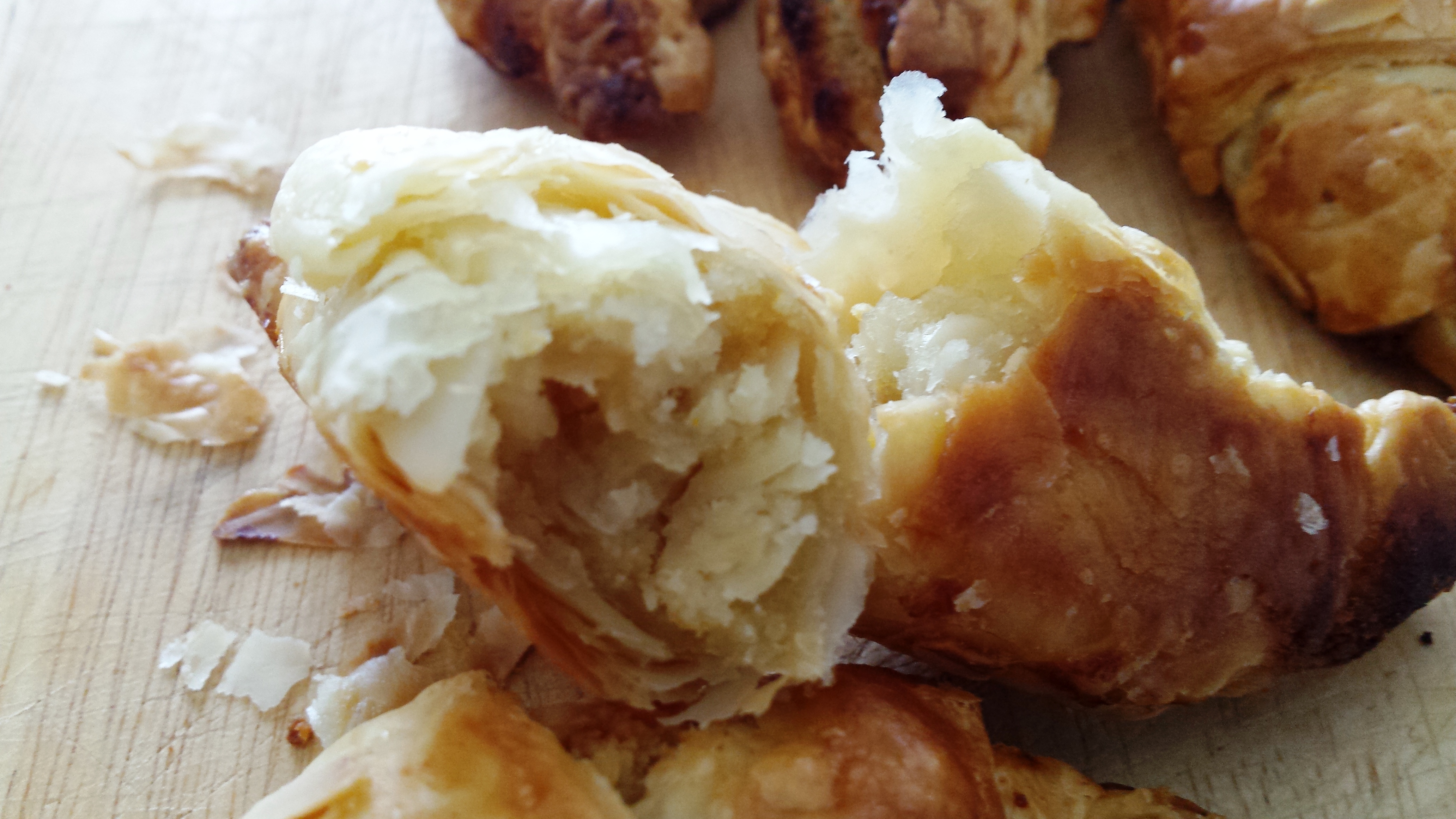 - Place your ready roll pastry on a lightly floured surface. Using a sharp knife, cut the dough diagonally to make about 10 triangles. Pull the tip of each triangle taut, spread a small spoonful of almond paste on each triangle, and then roll the croissants up from the base curving the ends slightly to make a crescent shape. Arrange each finished croissant on a lightly greased baking sheet with at least 1 1/2 inches between each pastry.