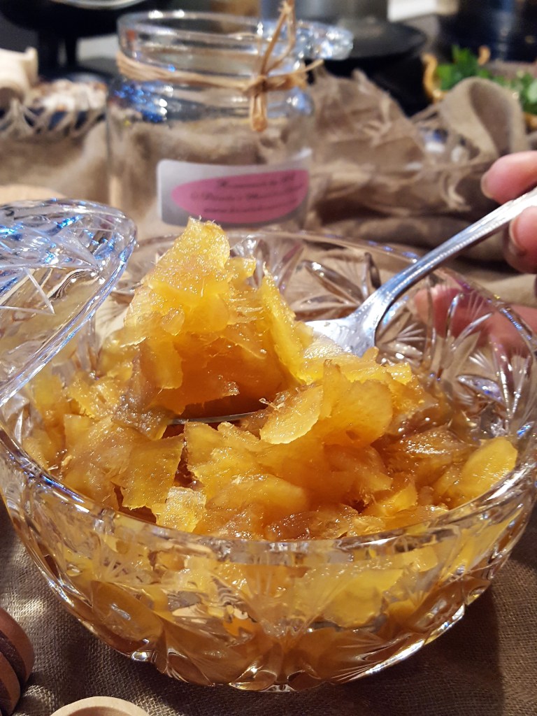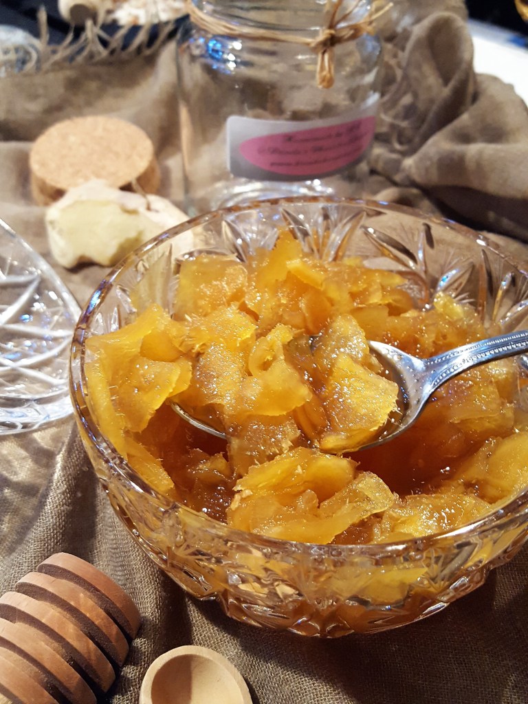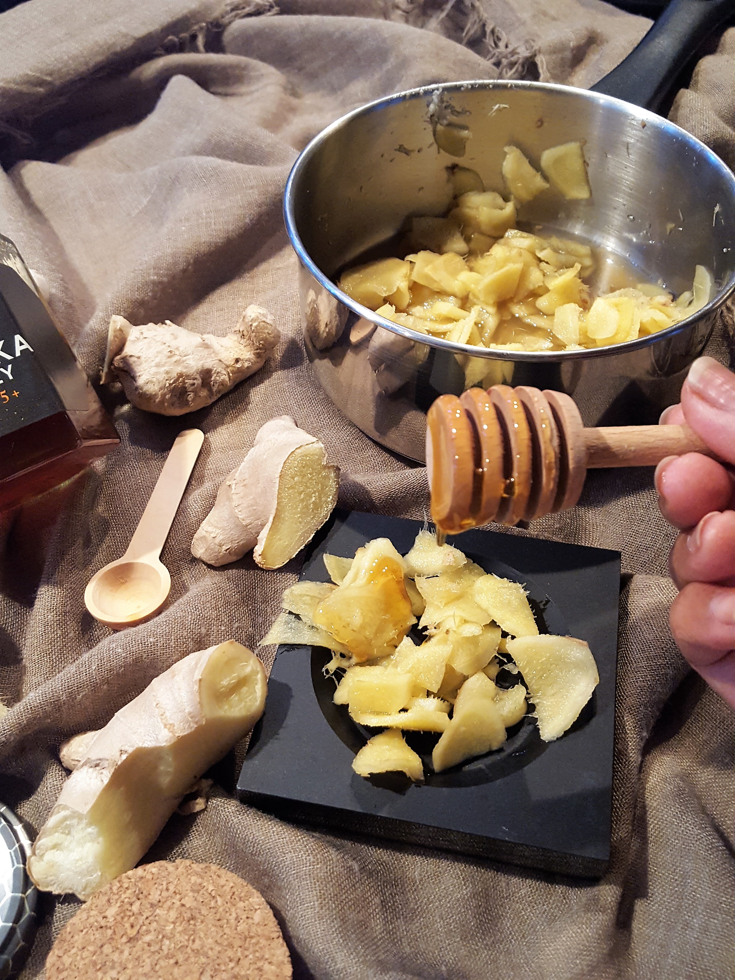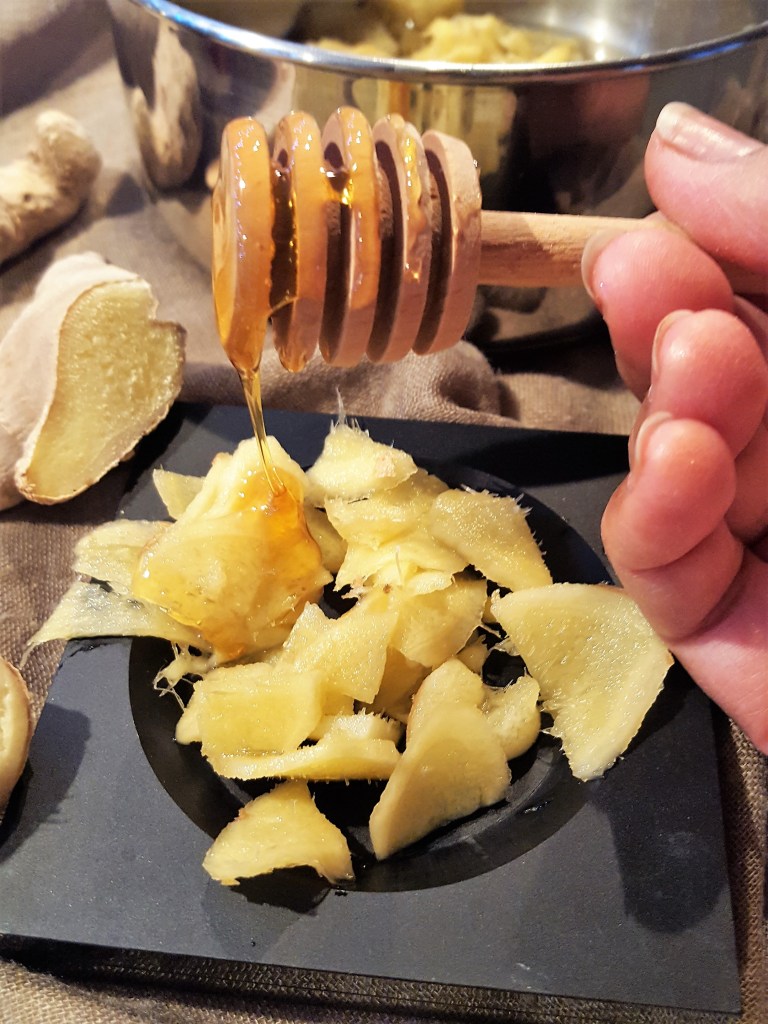 - Pour the honey into a saucepan and add the finely sliced ginger stem. On low heat let the mixture sit for 10 minutes, until the ginger takes on the glowing look.