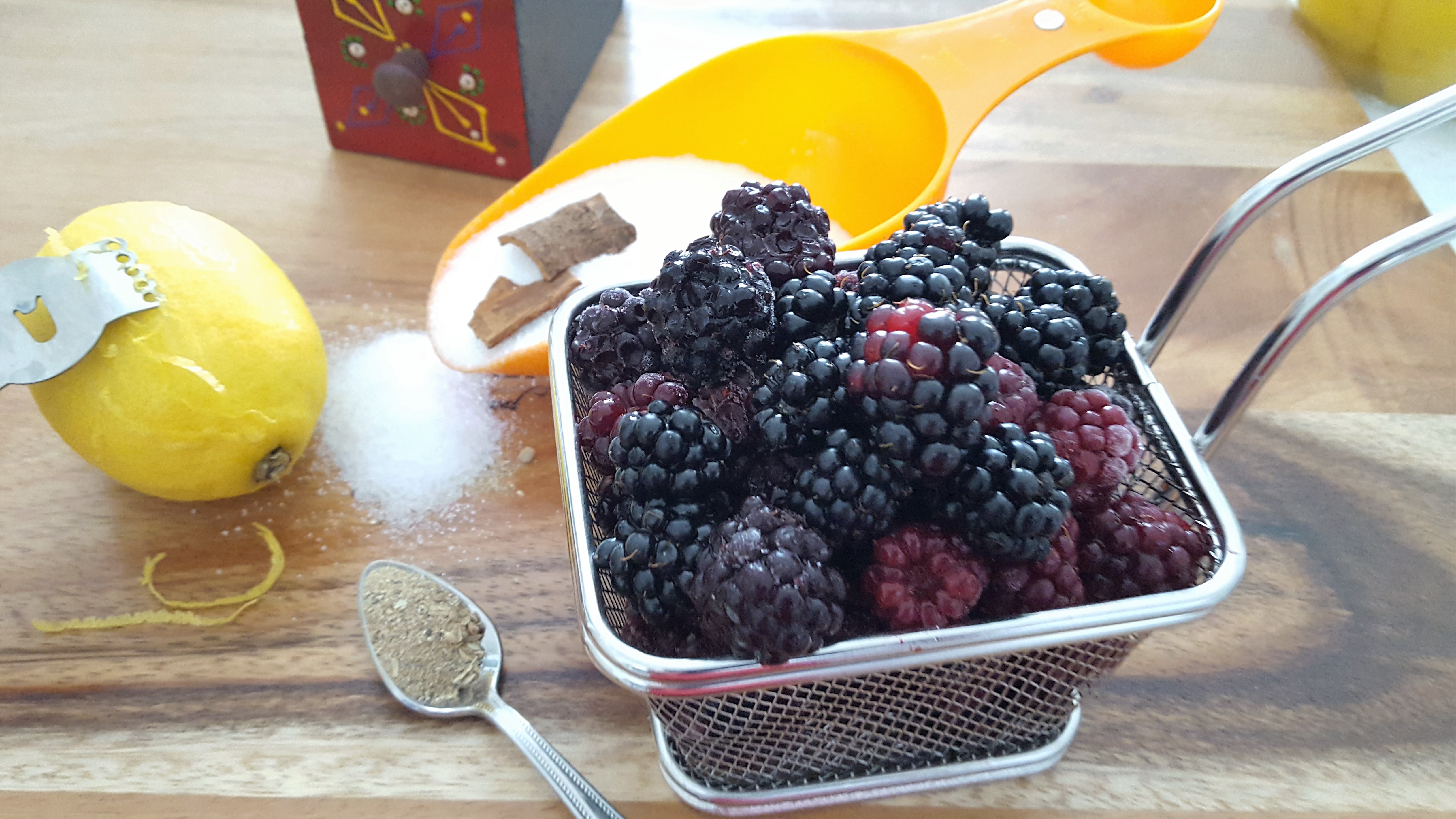 - Place a deep pan on the heat, add the sugar, cloves, cardamom, cinnamon and some water. As the sugar dissolves add the blackberries, lemon zest and juice. Increase the heat and cook until the blackberries start to break, this make take 10-12 minutes. The berries will soften and start releasing its juices