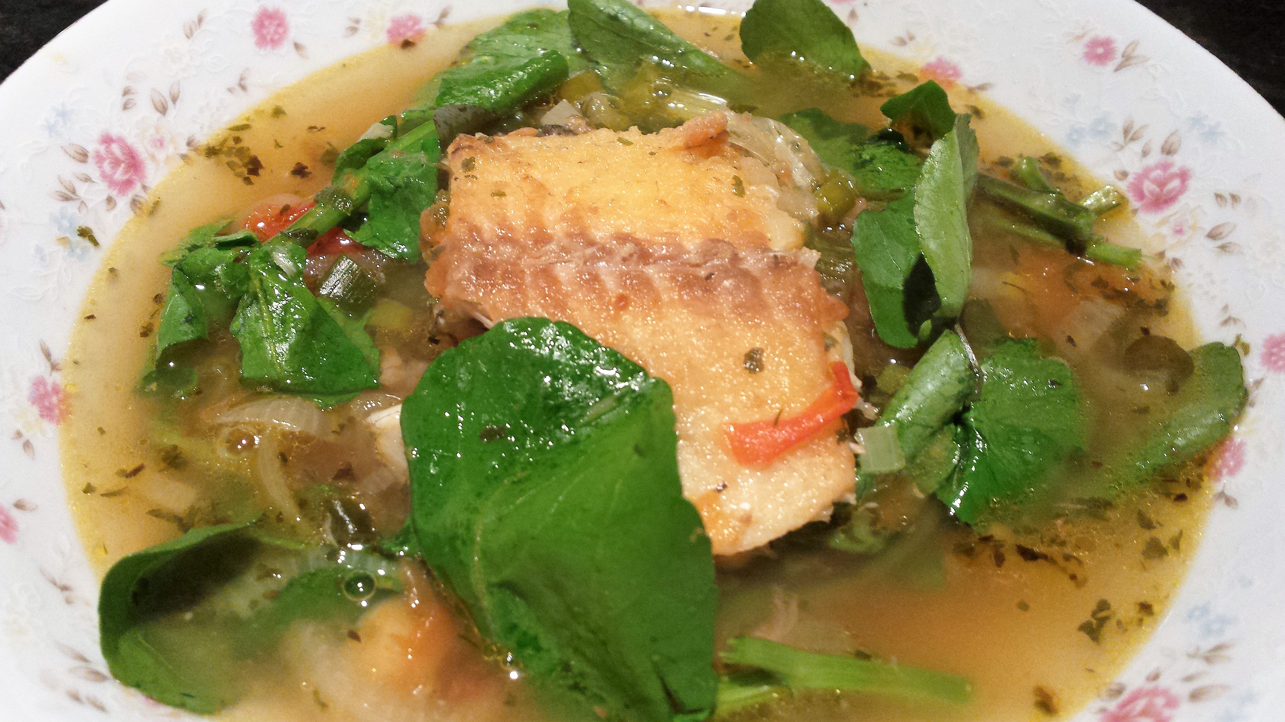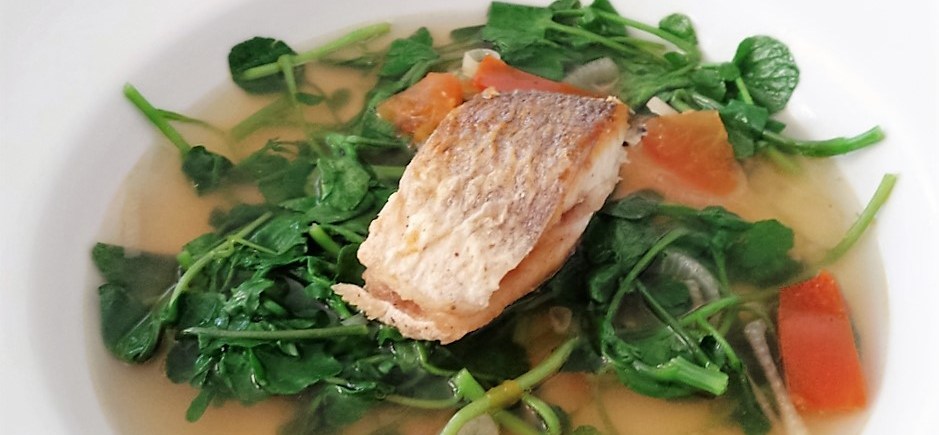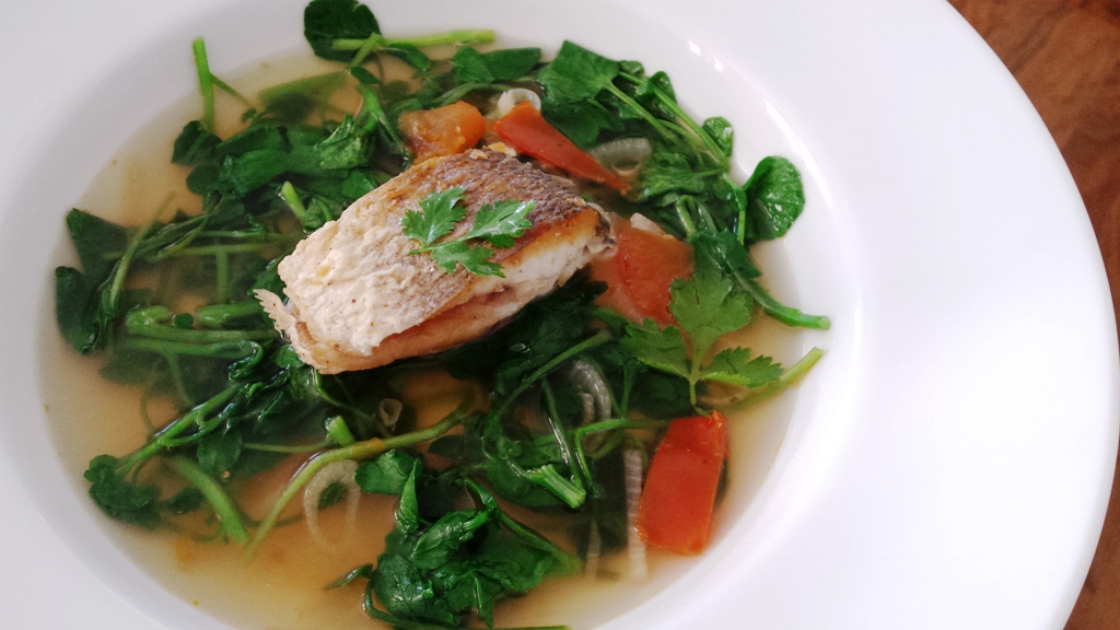 Fish soup is much easier and quicker than it appears. With very few simple ingredients this fish soup is a very healthy option and low in fat and an abundance of fresh taste. The addition of fresh watercress is very much a Mauritian style of making fish soup. Back in Mauritius watercress is usually substituted with Moringa Leaves – “Brede Mouroume” as it is in abundance on the Island and can be found in most people’s home garden.