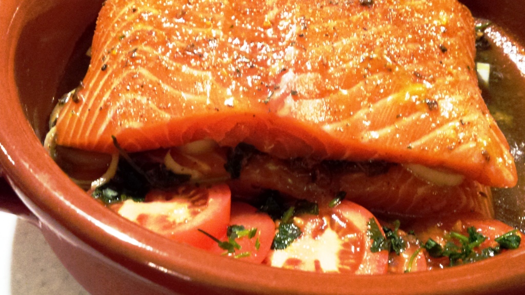 Cooking a whole filet of salmon is quite a show-stopper and special. If you want an Easy, Fancy, Deliciously Fresh Fish dish, it doesn’t get much better than baked/roasted salmon fillets, and as most of us would agree presenting a good piece of Salmon will rise to any occasion – a real centre piece. This recipe has the added touch of sheer luxury with the addition of Saffron strands to it making it even more decadent and special.