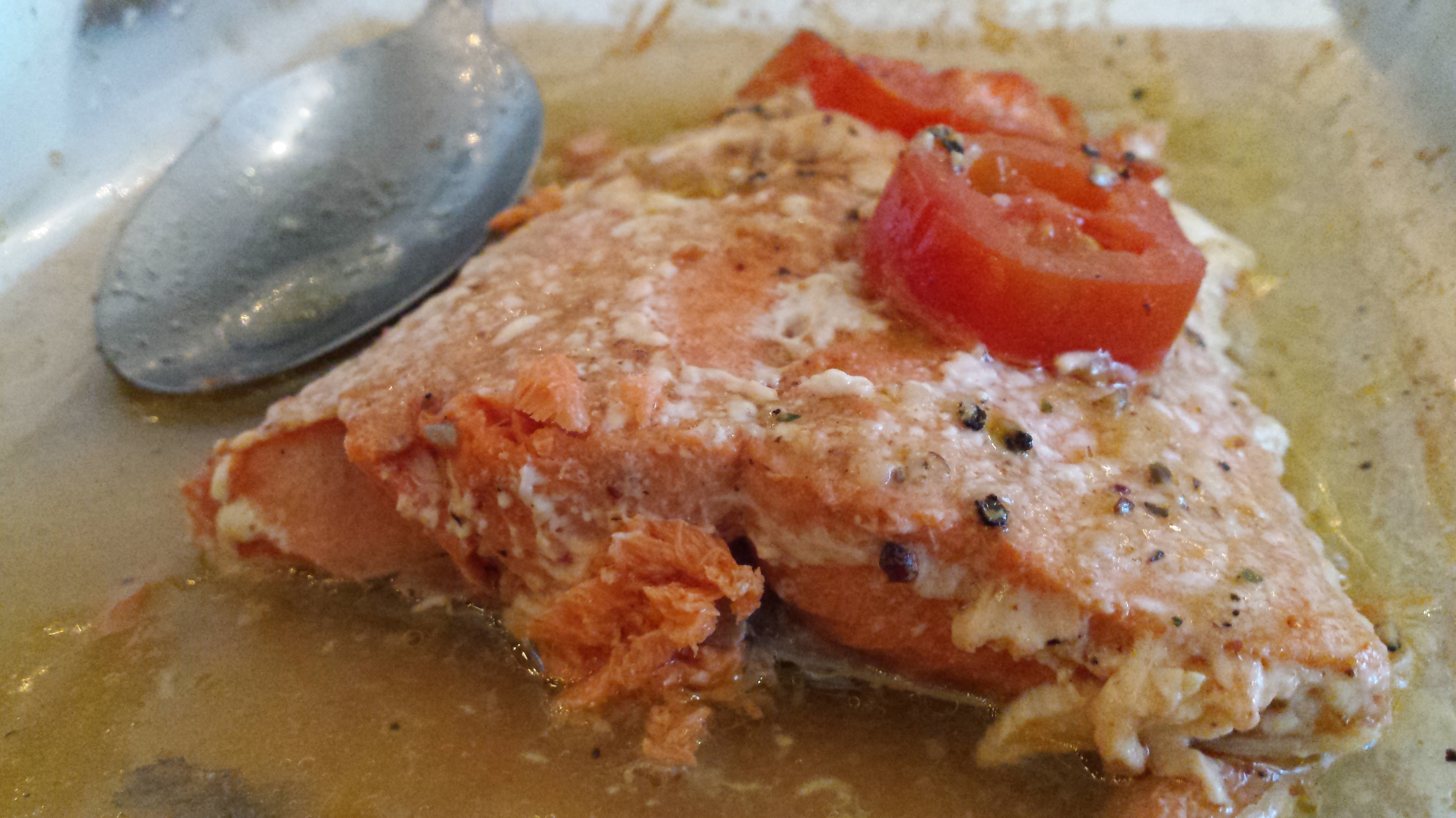 - Preheat the oven to 200°C, bake the salmon for 30 minutes. After this test if cooked by testing on the thickest side, using a shape small knife or fork if the salmon flakes easily, it’s ready. One other way to check is if you see a white milky trace on the salmon, and the fish has turned opaque, it’s ready – if the salmon is still dark pink inside it need more time to cook as it means it’s still raw. (Half way through the cooking using a long handle ladle bastes the fish with the juice as this will help keep the fish moist and juicy).