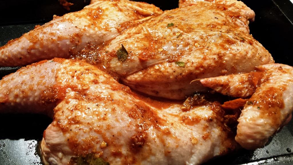Nothing complicated here this can be done by using a pair of kitchen scissors, cut in the middle and casually flatten the chicken. The technique of Spatchcocking requires splitting and flattening the chicken exposing the chicken surface area including the skin which is a real bonus of having more crispy chicken skins to enjoy.