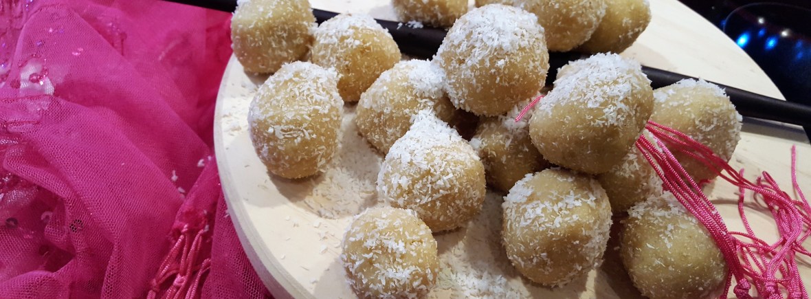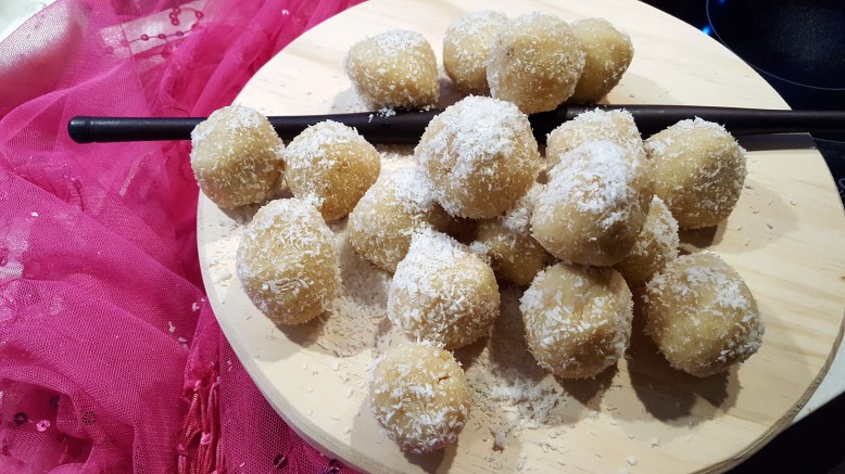 Weekend was no exception, waking up on a Saturday or Sunday morning with the sweet smell of something delicious wafting through the house was enough to get us out of bed. Mum always made these “ounde” with roasted ground rice but you can always substitute with Semolina making “suji ladoo”. Roasted ground rice is more time consuming because you need to roast the whole grain rice, then using a grinder, grind the rice to a fine powder, and sieve the powder to obtain the very fine powder. I am lucky because I don’t have to do all of this; mum still sends me the finished product – readymade roasted ground rice. Lucky me xxx