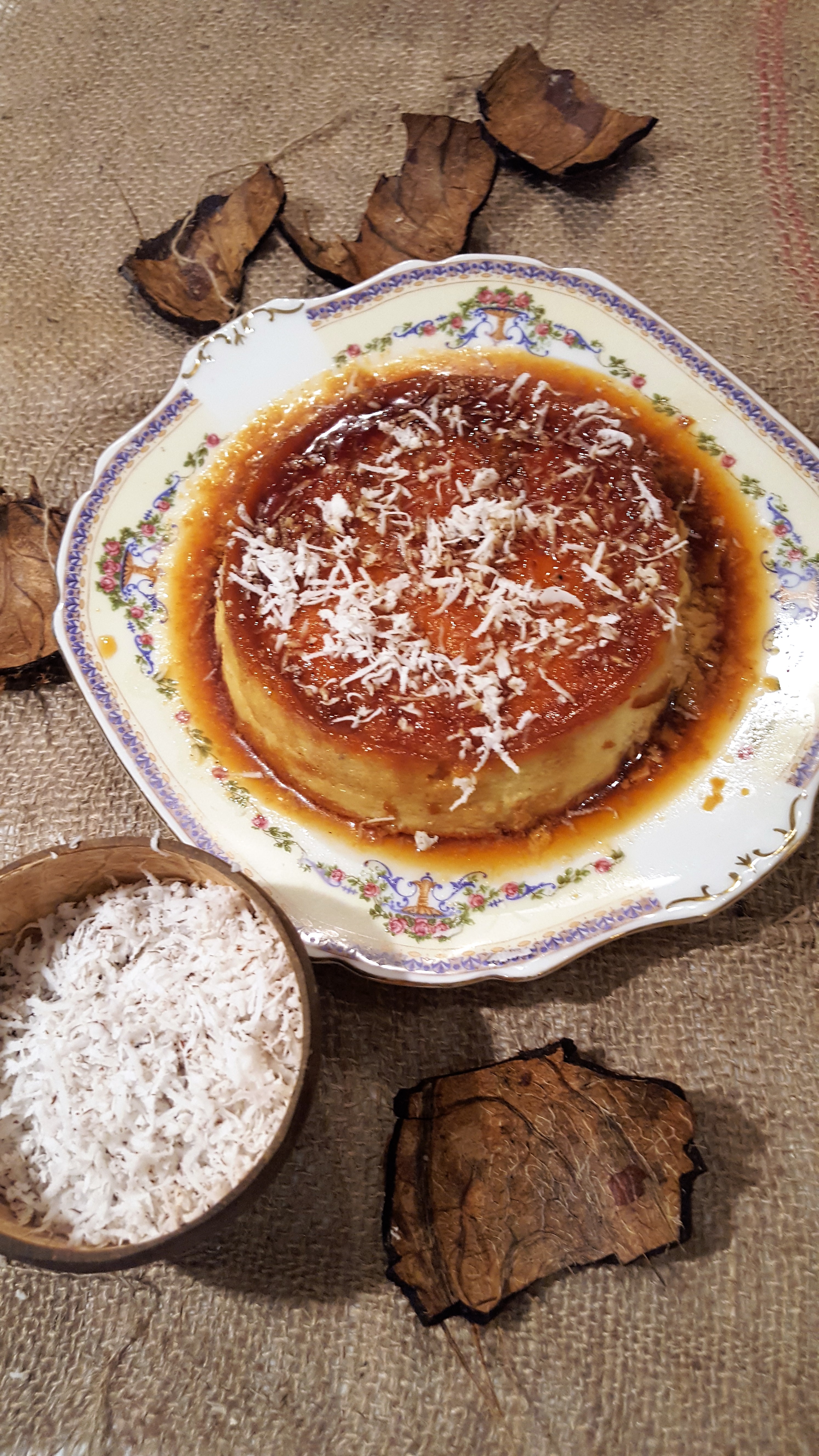 - In a medium saucepan over medium-low heat, melt sugar until it has dissolved and is golden in colour. Carefully pour hot caramel syrup into a 23cm round glass baking dish, turning the dish to evenly coat the bottom and sides. Scatter a layer of grated coconut and set aside.