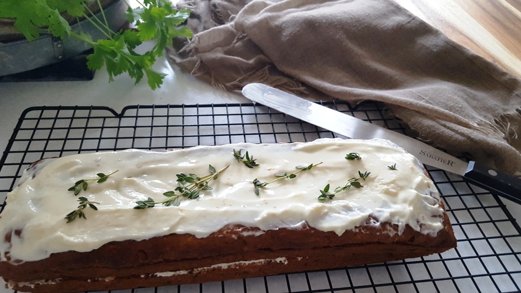 - Using a palette knife spread the cream cheese frosting over the cooled cake; finish off with a few sprigs of fresh thyme.