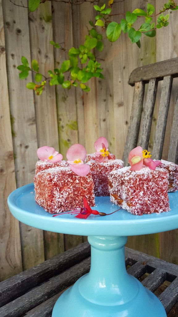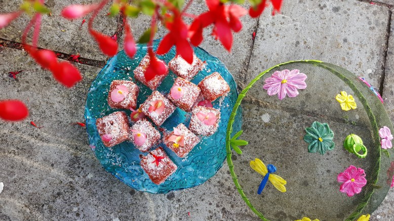 I have had so many requests to share the recipe; we call it simply “Gato Carré Rouge” simply translated into Red Cube Cake. It is in fact a Lamington cake, which is usually covered with chocolate and desiccated coconut, but in Mauritius these beauties are covered in a red sugary sirop and coconut. As you read my version of this recipe which I have recreated, I have added lime juice to the sugary coating which I will explain why.
