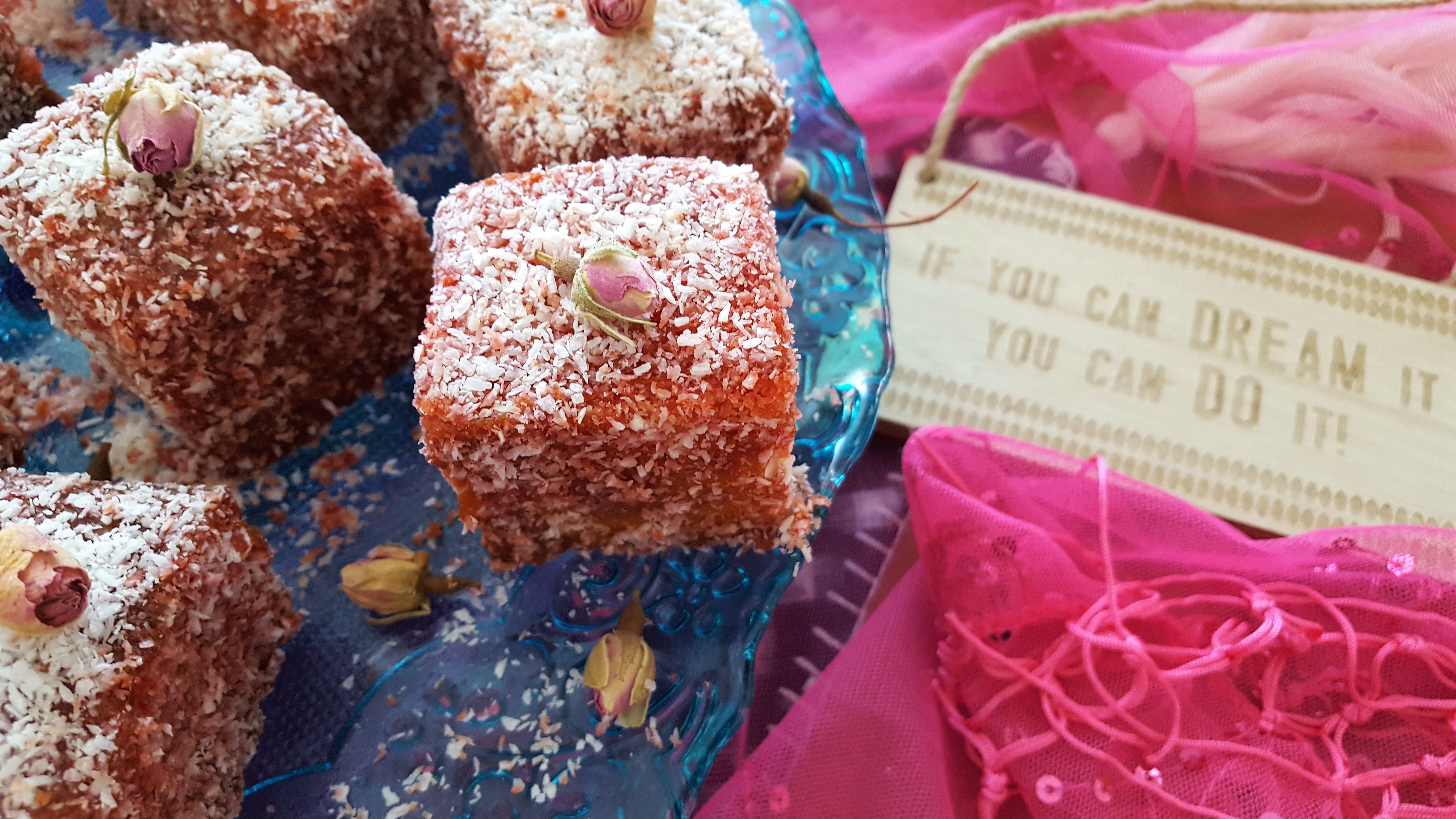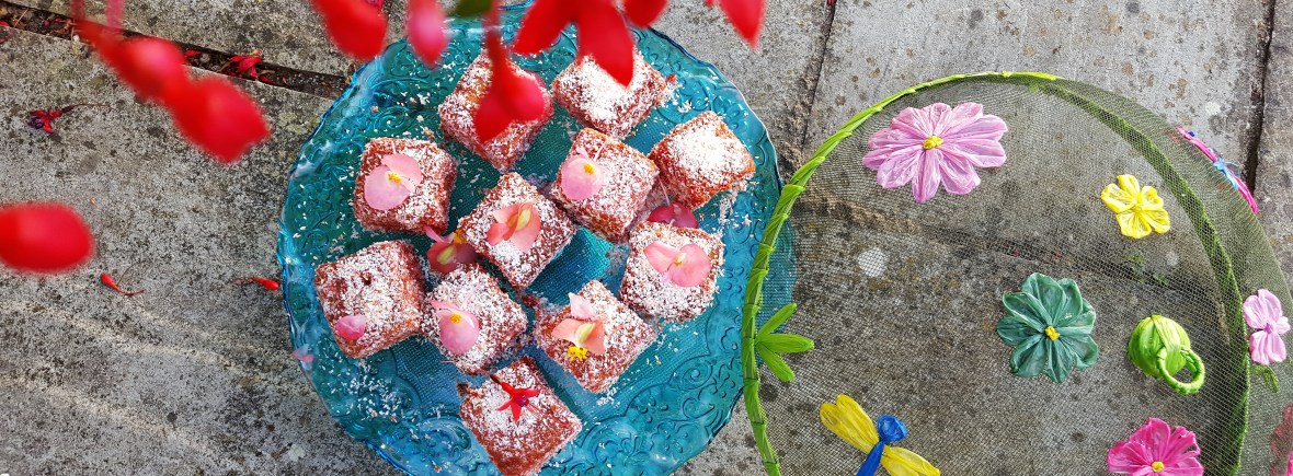 I have had so many requests to share the recipe; we call it simply “Gato Carré Rouge” simply translated into Red Cube Cake. It is in fact a Lamington cake, which is usually covered with chocolate and desiccated coconut, but in Mauritius these beauties are covered in a red sugary sirop and coconut. As you read my version of this recipe which I have recreated, I have added lime juice to the sugary coating which I will explain why.