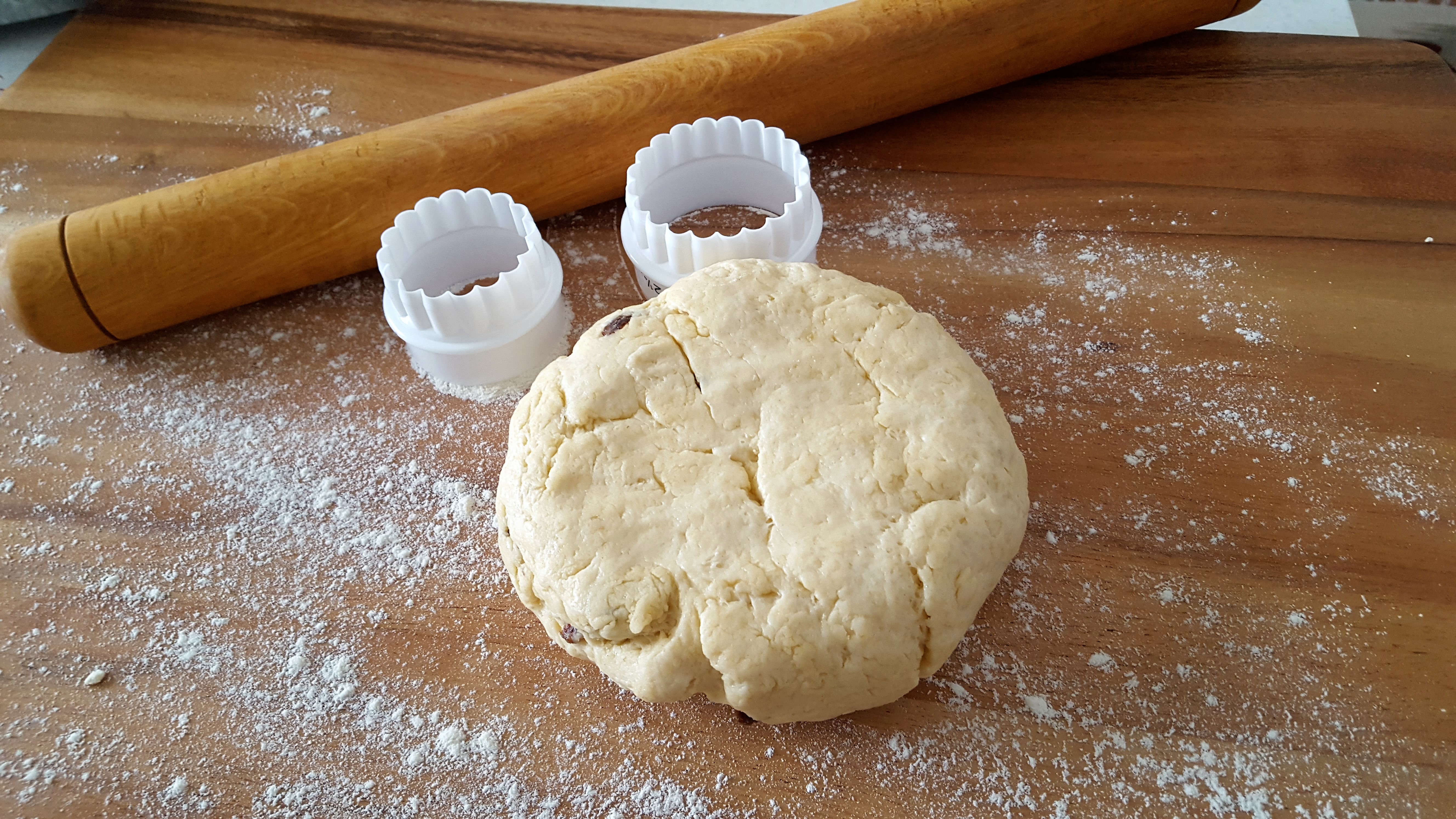 - Turn the dough onto a lightly floured surface and using a rolling pin lightly roll it out to a thickness of 1-2 cm (This is important if scones are rolled out too thin they won’t rise – again from past experience I made that mistake before).