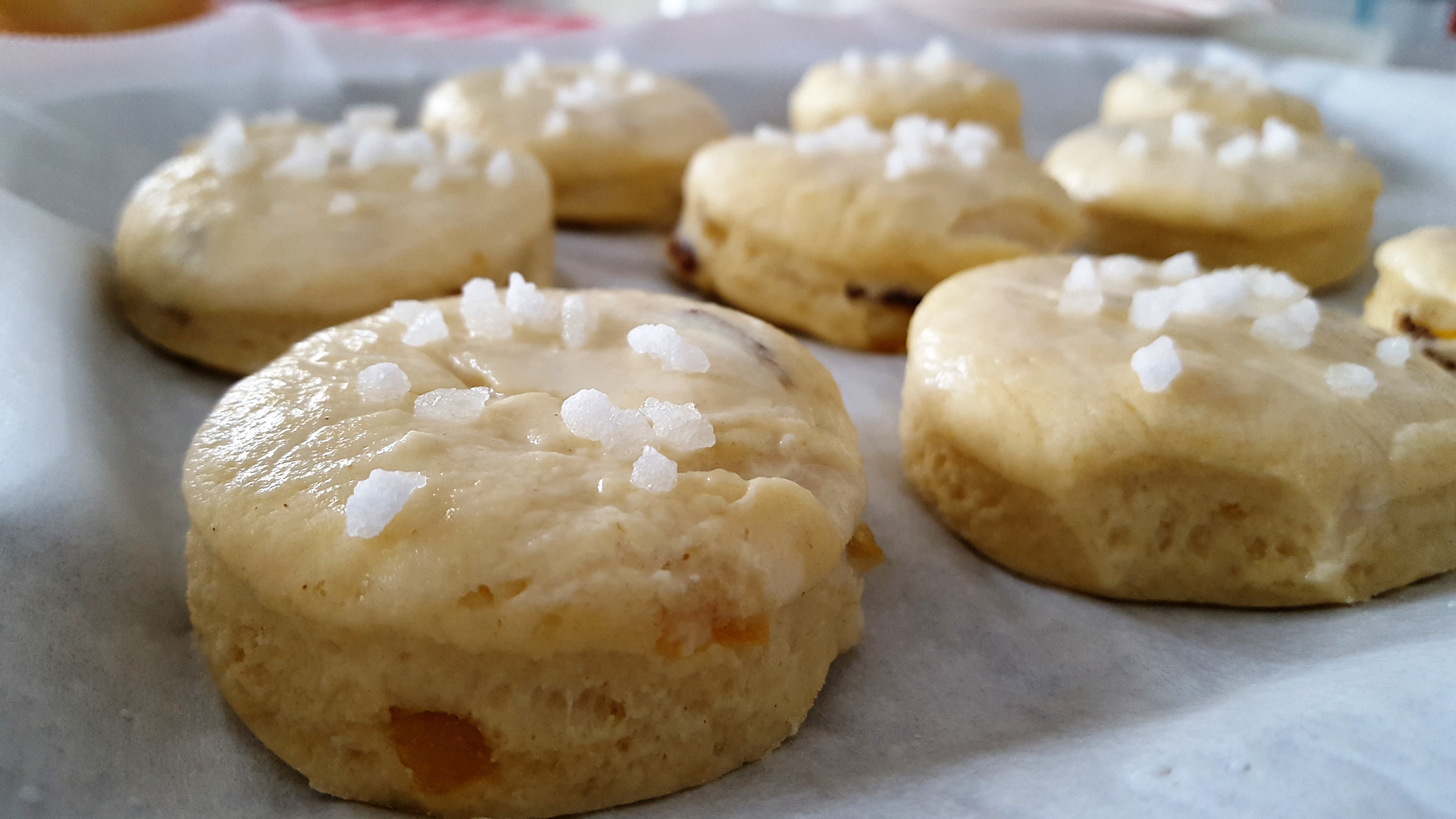 - Arrange the scones on the prepared baking trays and brush the tops with some milk to glaze.