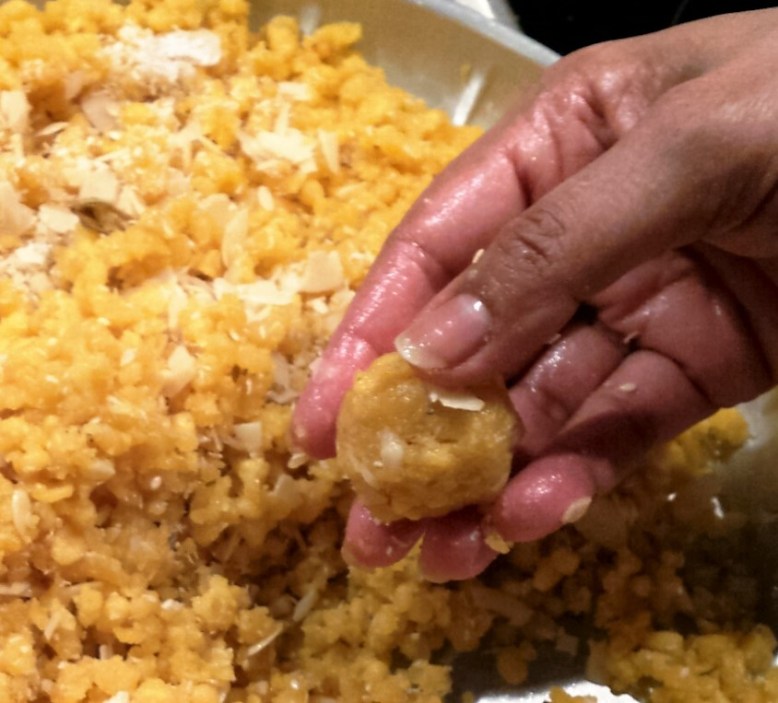 - Making the ladoos, apply some oil or ghee on your palms and shape the motichoor ladoos. To note, the mixture should be warm when preparing the ladoos.
