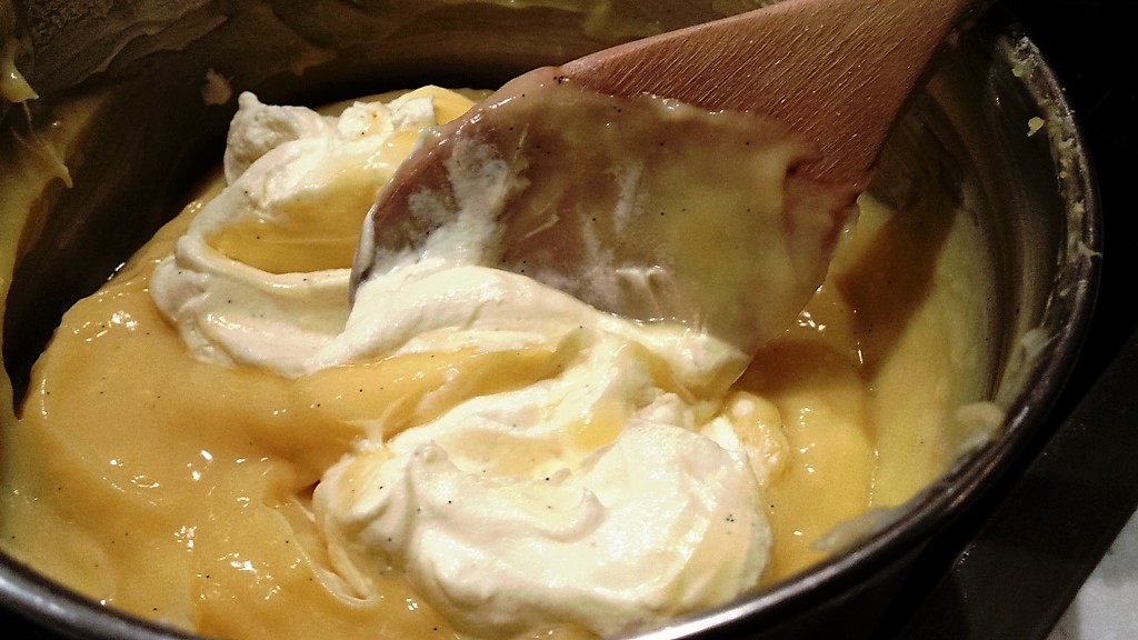- Take half of the whipped cream and fold in into the custard.