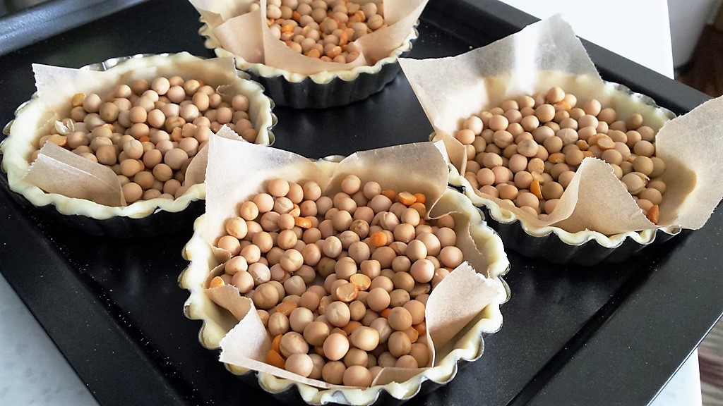 - Line the sweet crust into your tart moulds. Using a folk, prick the sweet crust.