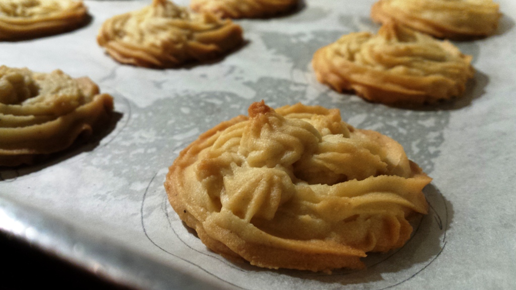 Tips: In order to get same size rosette, trace the circles on your greaseproof paper using a round cutter. When your start piping use the shape drawn as a guide to get the same size of biscuits.