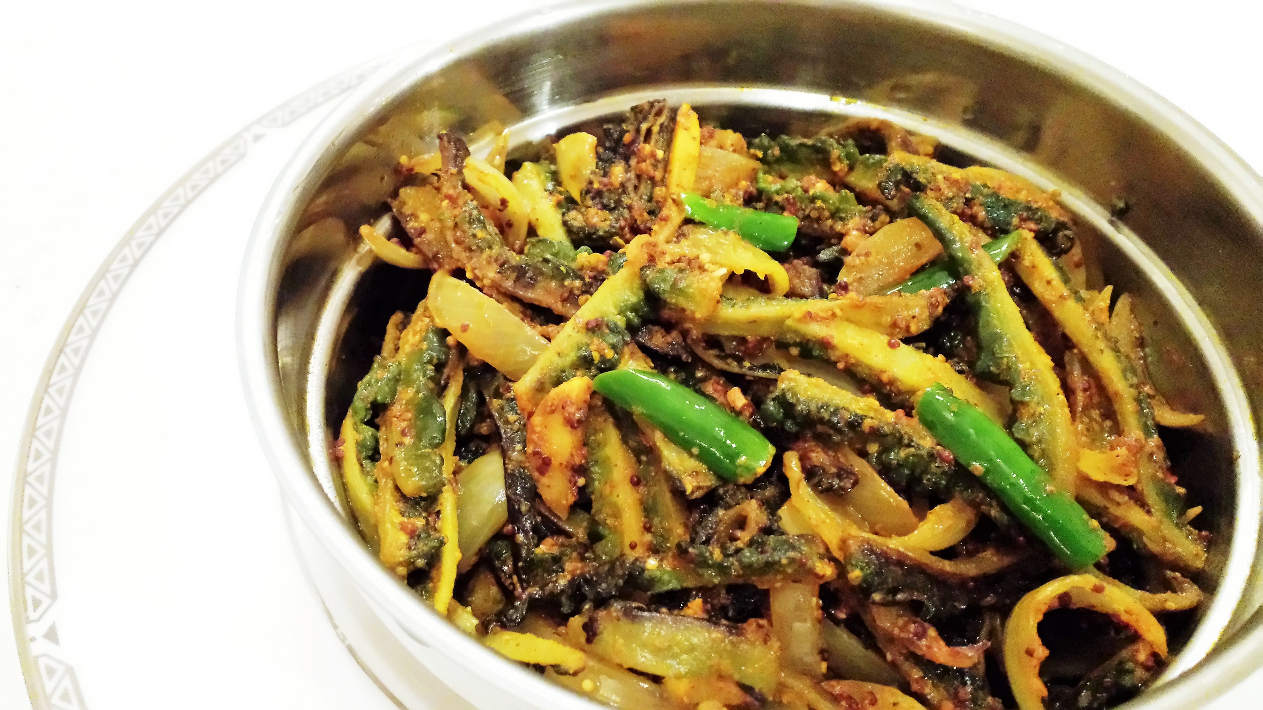- Add the fried Karela to the pan; toss gently until the vegetable is well coated with the vindaye mixture. Remove from the heat and add the remaining onion.