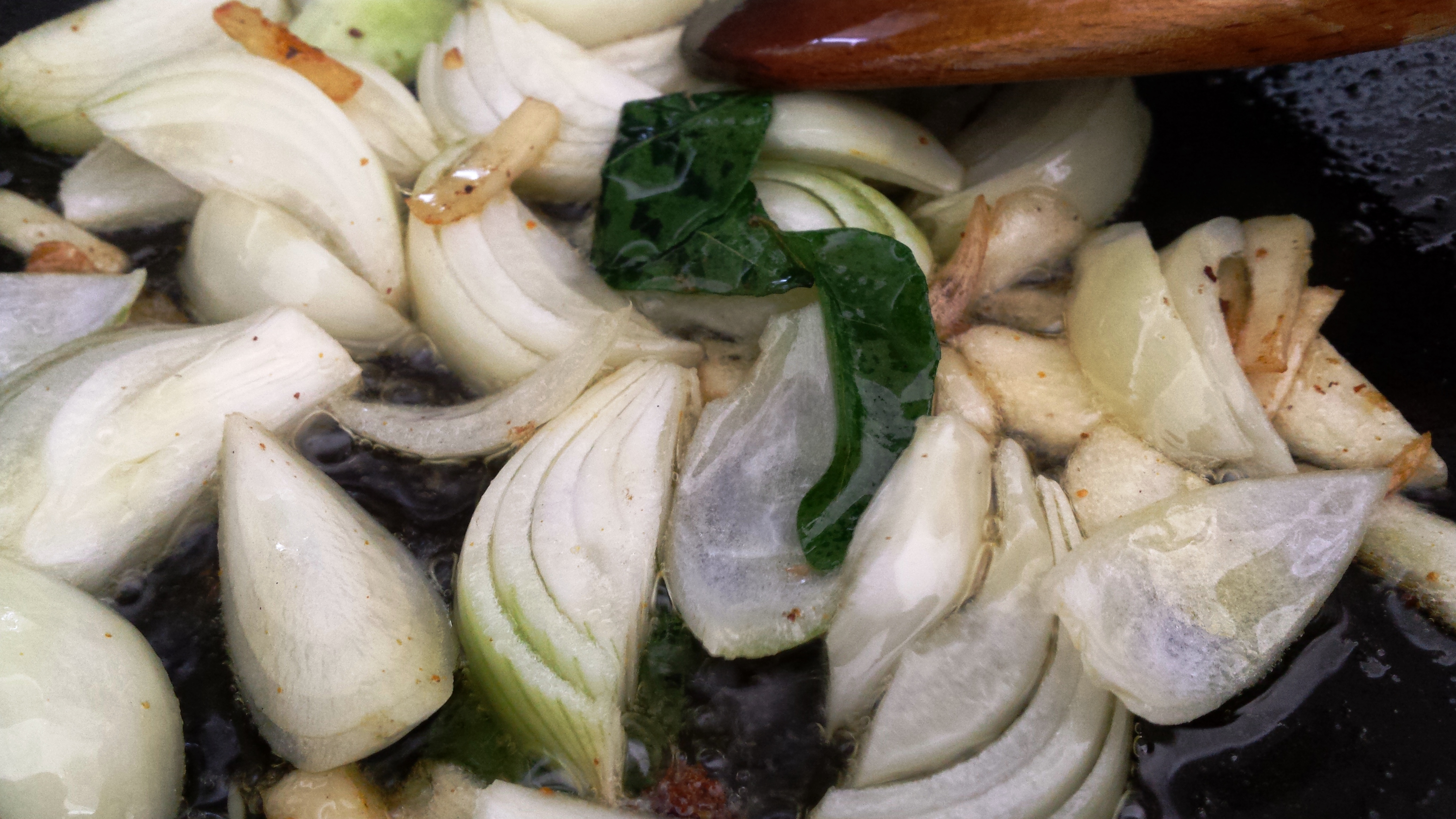 - Add some of the onion in the warm oil in the same frying pan you fried the vegetable. (If you find that when frying the Karela most of the oil has been consumed, add few more tablespoon of vegetable oil.) Cook the onion until slightly translucent over a medium heat. Do not fry the onion, as you want them to remain crunchy. Add the garlic, methi seeds and curry leaves.