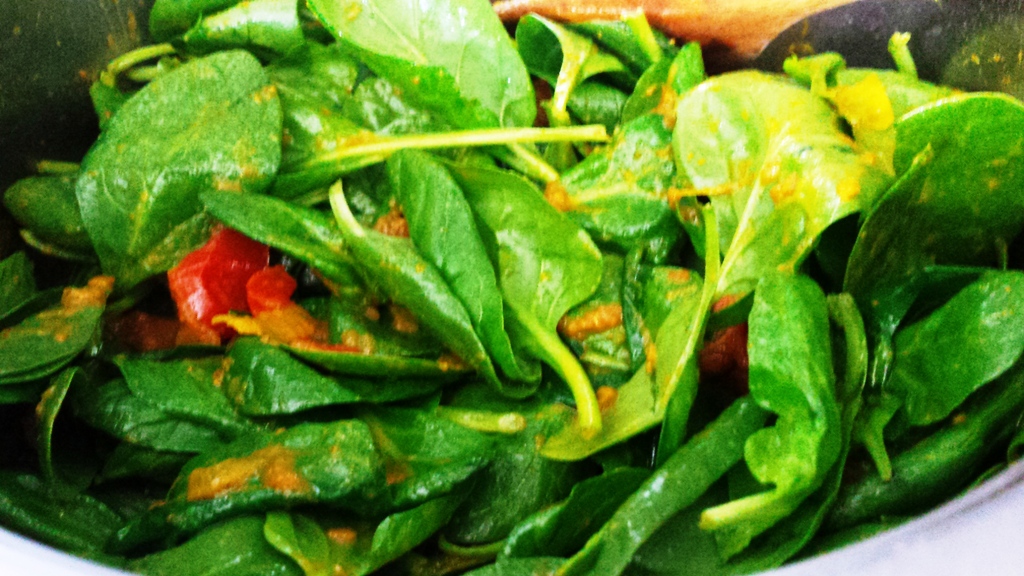 - Stir all together until golden in colour, add the garam masala, chopped tomatoes, spinach leaves and cook on a gentle heat until the spinach have wilted not but not mushy.