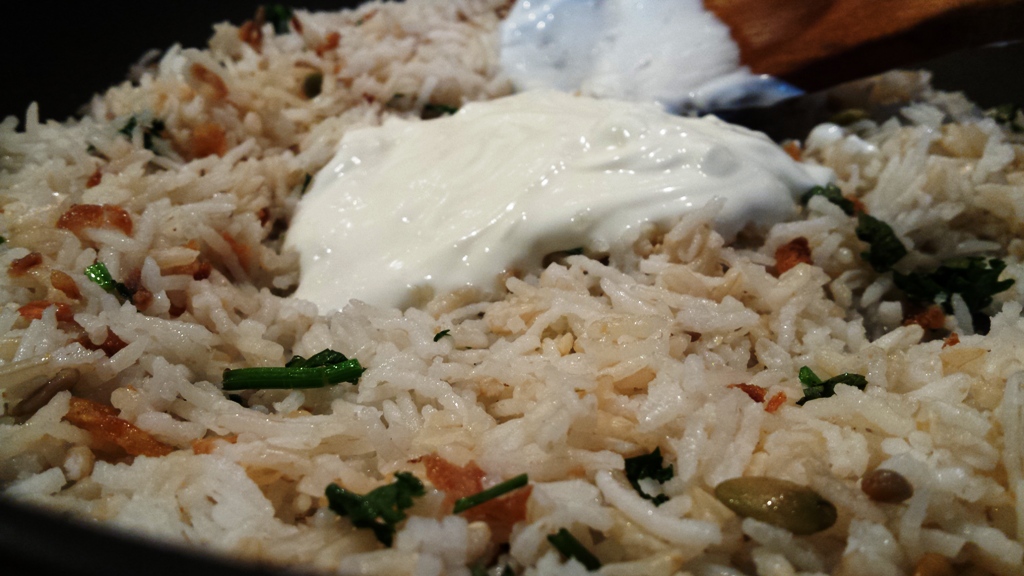 In just few minutes you can have Yogurt Rice with mixed seeds and crispy fried onion to enjoy. This is a very flash, quick and easy dish both healthy and refreshing quick midweek meal. You can have this rice with a tangy chilli tomato chutney or grilled meat or fish.